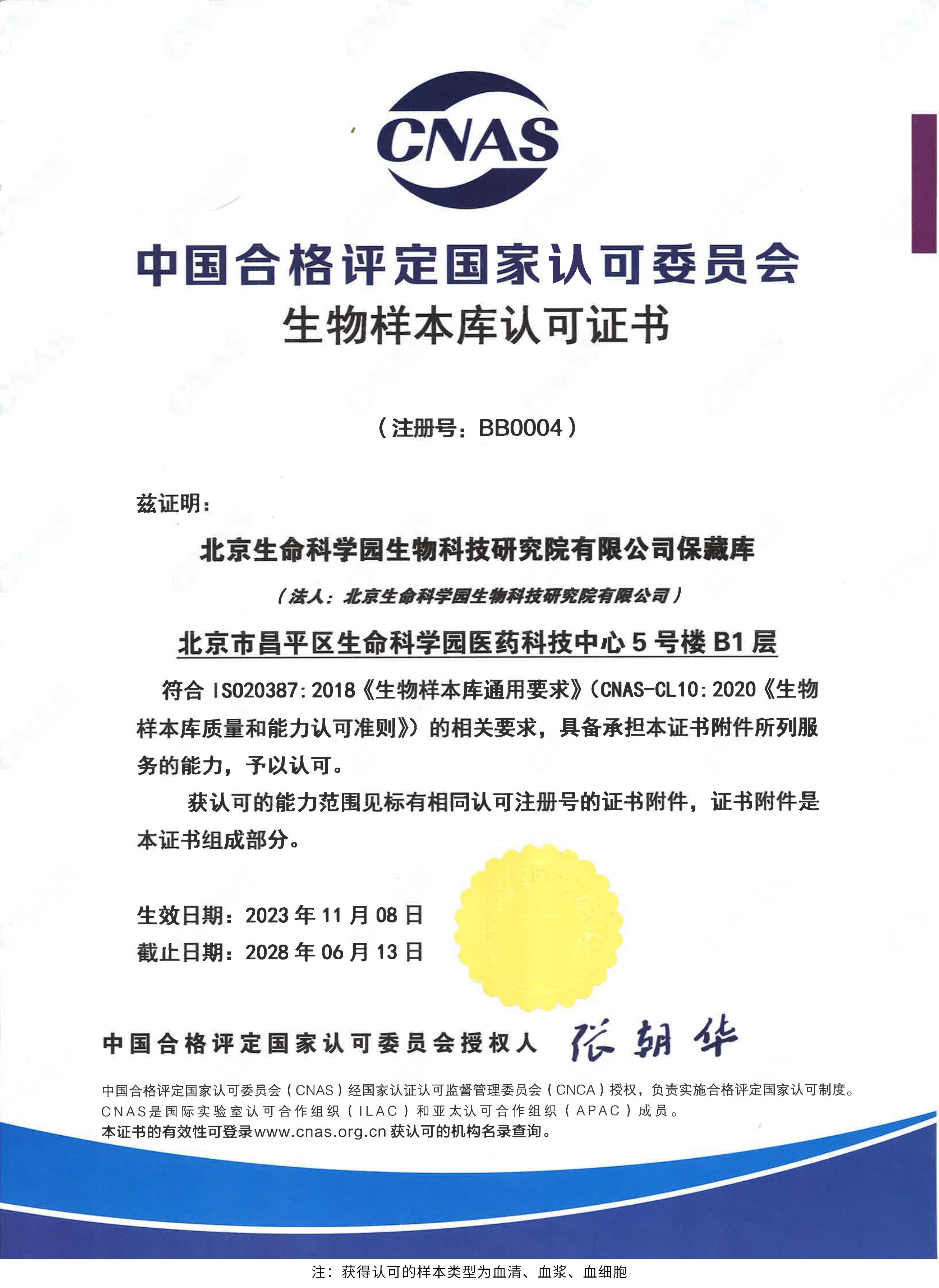 北京生命科學(xué)園生物科技研究院(以下簡稱“北京生物樣本資源庫”)(Biobank of Life Science Park,簡寫“BoLSP”)是一家由北京市科委和中關(guān)村生命科學(xué)園共同支持設(shè)立的第三方生物樣本庫公共服務(wù)平臺,秉承北京重大疾病臨床數(shù)據(jù)和樣本資源庫(以下簡稱“北京庫”)(Beijing Biobank of Clinical Resources,BBCR)十余年的發(fā)展成果,聚合眾多臨床樣本專家的專業(yè)共識,致力于在生命科學(xué)、生物醫(yī)藥研究領(lǐng)域發(fā)揮銜接樣本資源持有者與研究者的橋梁作用,解決生物樣本資源開發(fā)上下游信息不對稱、資源共享困難等問題。研究院在北京中關(guān)村生命科學(xué)園昌平園區(qū)建立了2000㎡生物樣本庫,最大存儲規(guī)模達1000萬份。研究院遵循CNAS-CL10:2020《生物樣本庫質(zhì)量和能力認可準則》,同時結(jié)合北京庫過去十年的工作經(jīng)驗與教訓(xùn),建立了一套完善的生物樣本保藏質(zhì)量管理體系,從人、機、料、法、環(huán)、控多個角度,實現(xiàn)生物樣本保藏過程的全面質(zhì)量控制,先后獲得國家科技部頒發(fā)的人類遺傳資源保藏行政許可證書和中國合格評定國家認可委員會(China National Accreditation Service for Conformity Assessment,CNAS)頒發(fā)的“CNAS認可證書”。